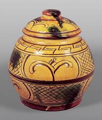 This is a piece by British potter Bernard Leach. He is known as the "Father of British Studio Pottery". Leach advocated for simple forms of pottery. His pots were ethical and promoted an aesthetic concern rather than functional. I chose this piece because it reminds me of a cookie jar and I can tell it was done on a wheel. I like the intricate artistic details on the pot and how the lid looks like it has different layers even though it is just a paint effect.